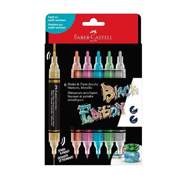 Create bold and expressive marks on multiple surfaces with Faber-Castell black edition shake and paint acrylic markers -  With highly pigmented opaque water-based acrylic ink across two versatile nibs, these markers unlock individuality and can transform surfaces from drink bottles to backpacks with bold designs that stand out from the crowd