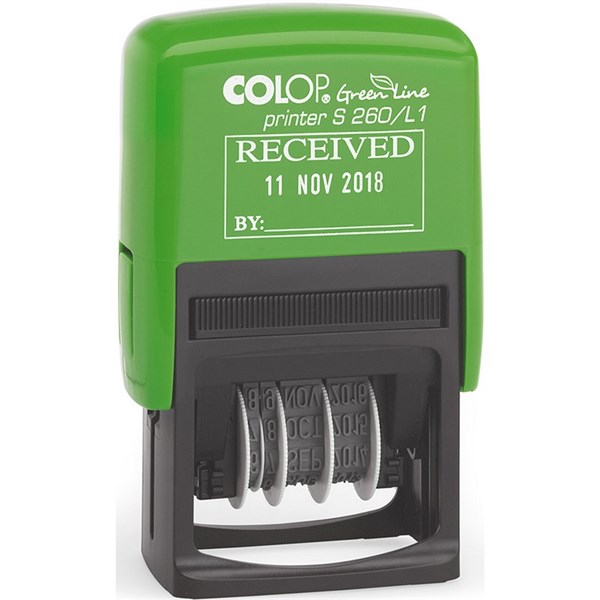 Colop Green Line S260 is one of the smallest models of a date and word stamp - Plastic self-inking band stamp made predominantly from recycled materials