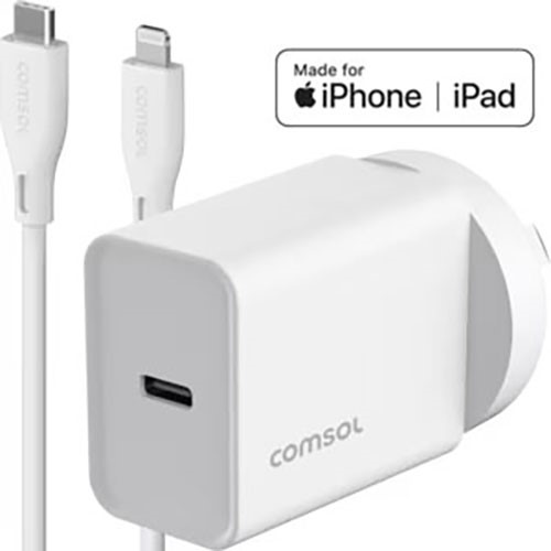 The Comsol USB-C Wall Charger 20W with 1.5m USB-C to Lightning Cable (AC20KCLW) offers a complete charging solution for Apple devices