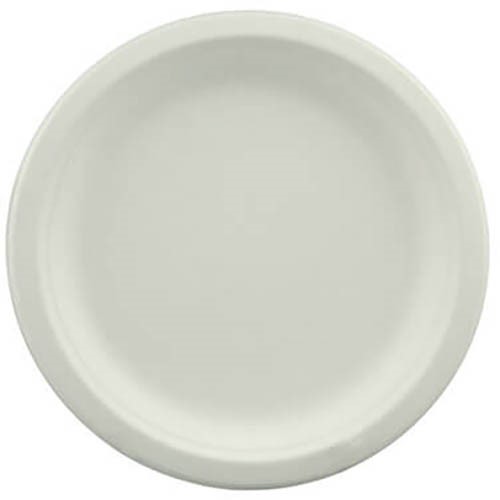 - Round 9 inch plate made of sugarcane bagasse, a 100% renewable material