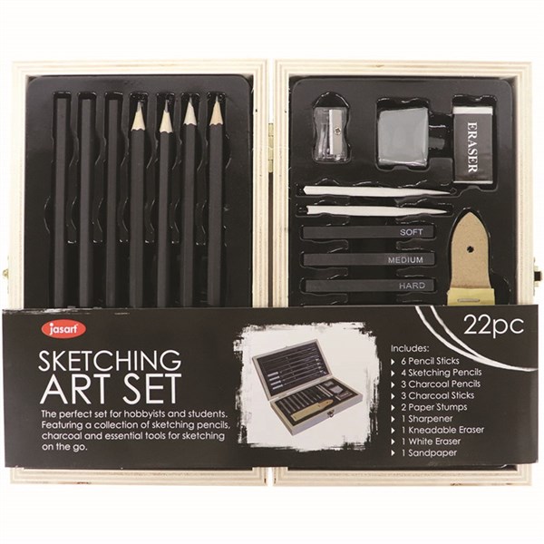 Jasart Drawing & Sketching Sets are ideal for hobbyists and students - Sketching Wooden Art Box Set 22 includes: 6 Pencil Sticks, 4 Sketching Pencils, 3 Charcoal Pencils, 3 Charcoal Sticks, 2 Paper Stumps, 1 Sharpener, 1 Kneadable Eraser, 1 White Eraser, 1 Sandpaper
