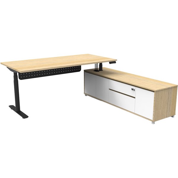 - The integrated side cabinet provides ample storage with drawers and cupboards, enhancing workspace organisation and keeping your essentials within easy reach