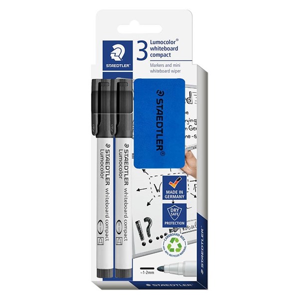 The Staedtler 341-9 set features two black markers and a mini whiteboard wiper, ideal for smaller whiteboards - With a universal tip for 1-2mm line widths, the fast-drying, low-odour ink wipes clean from surfaces like glass