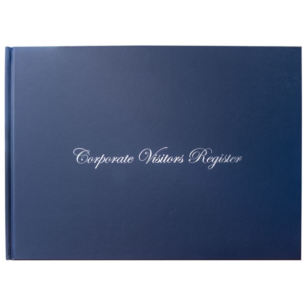 - The book has a navy hard cover with cursive writing on the front to give your reception area and elegant touch