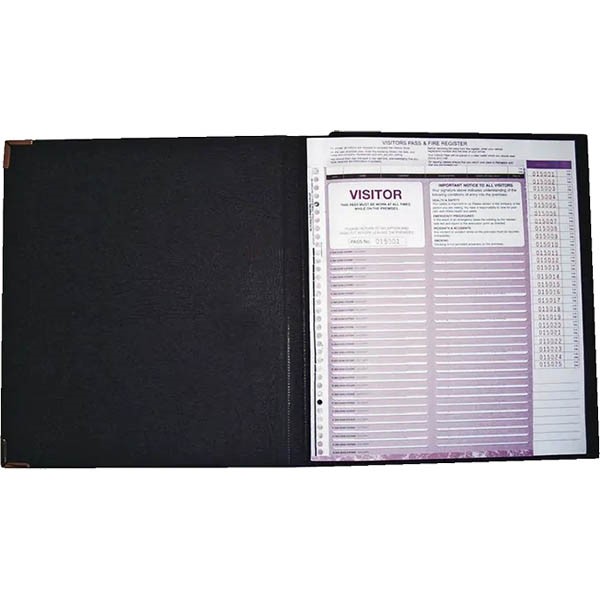 - Visitors Pass Binder - Quality black padded binder, gold blocked 'Visitors' with protective brass corners. Built in writing plate forms part of the binder