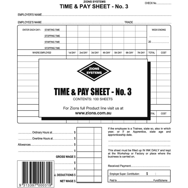 ZIONS TIME AND PAY SHEETS 3 PACK 100