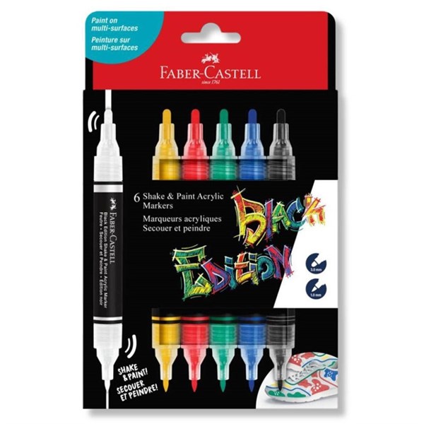 Create bold and expressive marks on multiple surfaces with Faber-Castell black edition shake and paint acrylic markers - With highly pigmented opaque water-based acrylic ink across two versatile nibs, these markers unlock individuality and can transform surfaces from drink bottles to backpacks with bold designs that stand out from the crowd