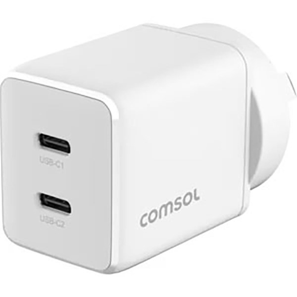 The Comsol 35W Dual Port USB-C GaN Wall Charger (AC35C2W) delivers powerful and efficient charging for multiple devices at once - Equipped with GaN (Gallium Nitride) technology, it ensures high performance with less heat and a compact design