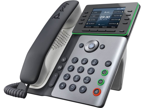 The phone features HD voice quality powered by Poly audio technology for clear, natural conversations