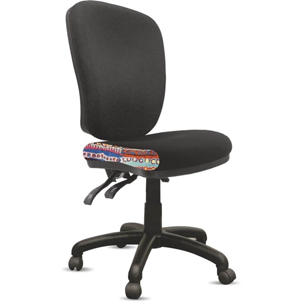 - A unique commercial fabrics designed by Nelly Patterson (Indigenous Artist) combined with K2 black fabric to upholster the chair