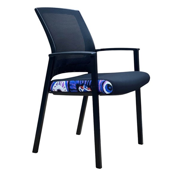 This chair is designed for aged care, education, visitor seating, break-out zones or any office areas with indigenous fabric and black commerical fabric upholstered for the seat